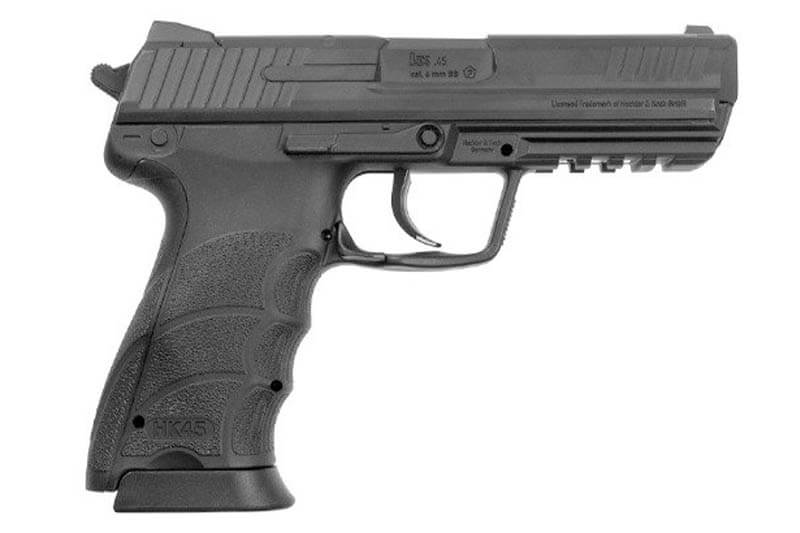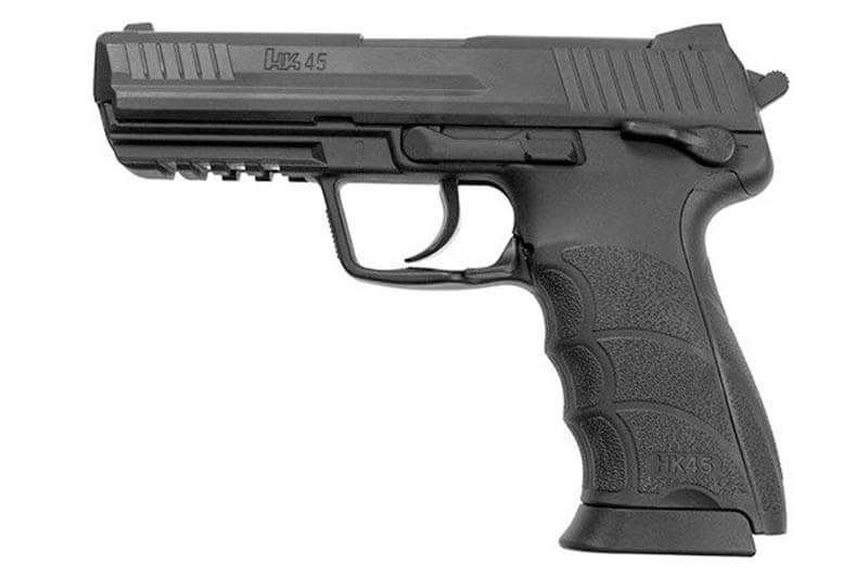 Replika pištolja H&K HK45, koji radi s kapsulama CO2 i proizvodi se prema licenci Heckler & Koch. Ovaj metalni i polimerni model je licensiran i označen kao original.