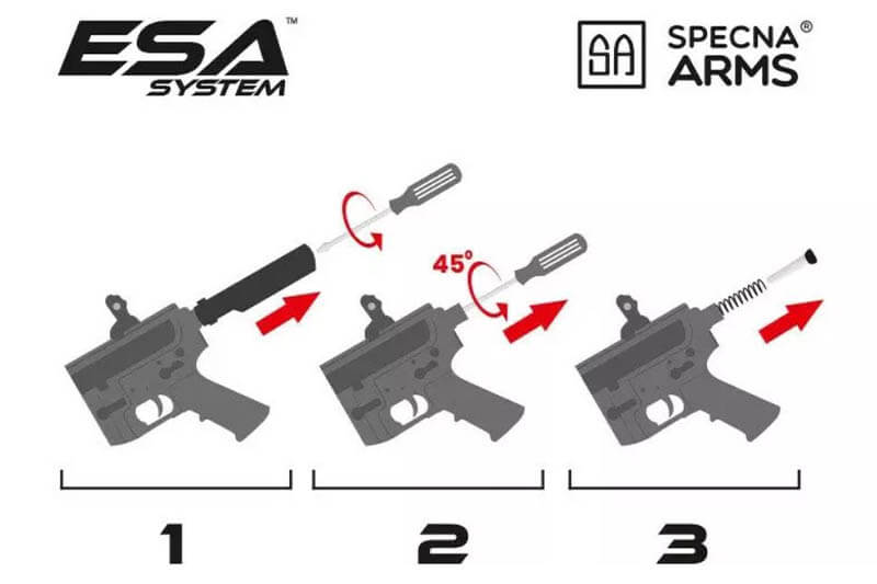 Replika ima ESA™ sistem brze promjene opruge. Zahvaljujući tom sistemu moguće je brzo i brzo prilagoditi snagu replike uslovima koji se očekuju na terenu bez potrebe za pristupom radionici ili setu specijalnih alata.