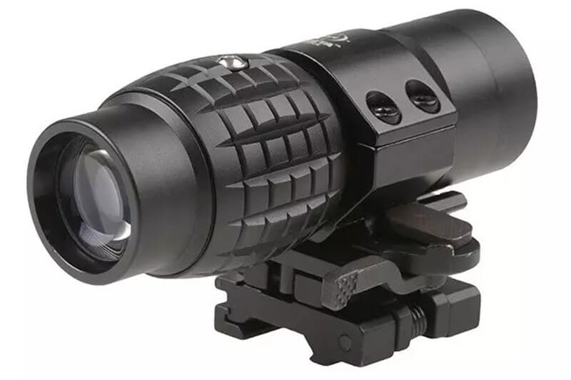 Theta Optics 3×35 Magnifier Scope je kompaktna i robusna optička naprava dizajnirana za poboljšanje preciznosti ciljanjem na srednjim udaljenostima, posebno u airsoft igrama. Ovaj povećavač pruža 3x uvećanje i kompatibilan je s kolimatorskim nišanima, omogućujući brzo prebacivanje između uvećanog i standardnog pogleda zahvaljujući Flip-to-Side (FTS) montaži.