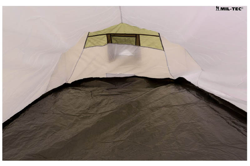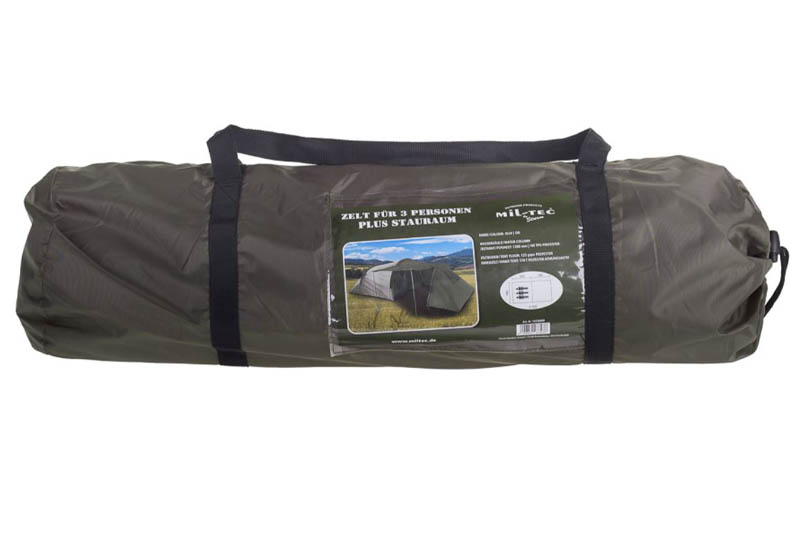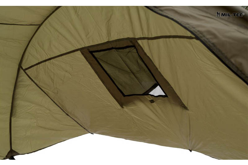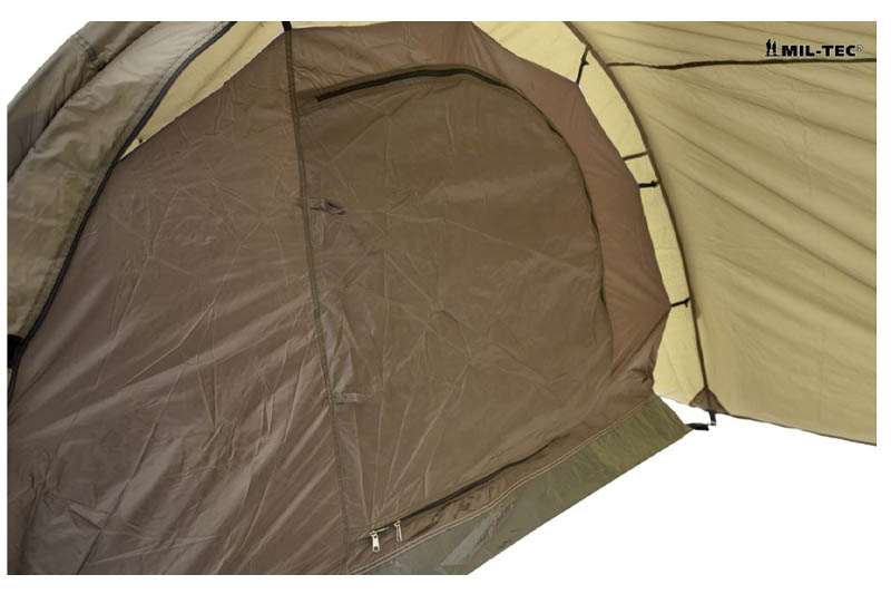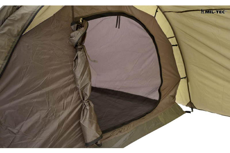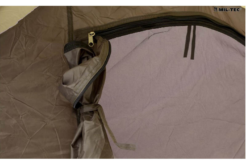 Moderan šator. Proizvod njemačke tvrtke Mil-Tec® specijalizirane za vojnu opremu. Preporuka za ljubitelje aktivnog odmora, turizma, preživljavanja i aktivnosti na otvorenom. Idealno za obitelj. Dvodijelna konstrukcija šatora s neovisnom zaštitom osigurava bolju toplinsku udobnost, olakšava postavljanje i utječe na ukupnu udobnost. Vodootporan i otporan na vjetar. Prostran, ali lagan i malen kada se sklopi. Brzo i jednostavno postavljanje. Velika pokrivka izrađena od originalnog materijala 190TPU poliester. Vodootporan je do 1200 mm vodenog stupca. Ne kvasi i ne curi gdje ga nešto dotakne. Izdržljiv i otporan na sunce. Ne truli i ne pljesni – brzo se suši. Soba za osobe izrađena od prozračne mreže protiv komaraca od 170T poliestera pruža potpunu zaštitu od insekata. Pod je izrađen od vodootpornog i debelog materijala koji odbija prljavštinu. Visoki rub poda sprječava poplavu tijekom jake kiše. Veliko predsoblje savršeno je za kuhanje, skladištenje velike prtljage, pa čak i bicikla. Ventilacijski sustav omogućuje propuh. Dva velika ventilacijska otvora osigurana kapuljačom. Učvršćeni rub omogućuje kontinuirano otvaranje ventilacijskih otvora, mogućnost zatvaranja na čičak. Širok i udoban ulaz u vestibul opremljen krovom, mogućnost zatvaranja i rolo krova. Spavaća soba je opremljena ulazom s mrežom protiv komaraca i neprozirnim zidom. Dvosmjerni patentni zatvarači s dvosmjernim klizačima – mogu se zakopčati s unutarnje i vanjske strane. Okvir je izrađen od fleksibilnog stakloplastike, presavijen i povezan gumom za jednostavno organiziranje. Šator je stabilan i dobro zategnut. Sustav podesivih vezica i klinova za tlo štiti od jakog vjetra. Mogućnost zatvaranja šatora – klizači opremljeni rupom zahvaljujući kojoj na njih možemo staviti lokot. Vrpce za porub šatorskih preklopa. U setu je navlaka s praktičnom transportnom ručkom.++