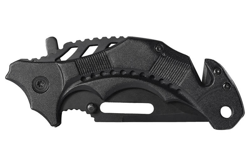 Crni nož tipa karambit s crnom oštricom od nehrđajućeg čelika koja se sklapa i aluminijskom i ABS drškom. Crna oštrica od nehrđajućeg čelika je lagano zakrivljena i dobro naoštrena samo s jedne strane s oštrim vrhom sa tiskanim logotipom i kromiranom vidljivošću. Drška koja ne klizi s karambit-like prstenom od aluminija i crnog ABS-a i kromiranim dijelovima. Lateralno ručno otvaranje oštrice također je opremljeno blokadom za oštricu koja osigurava zatvaranje oštrice za jednostavnu upotrebu. Neophodan alat za lov, ribolov i vaše izlete na otvorenom, ali zbog precizne izrade vrijedan nož za dodavanje u vašu kolekciju.